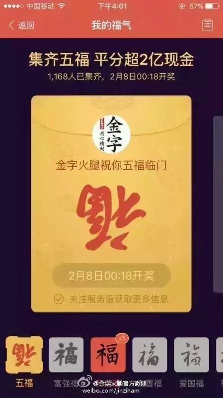 自前幾天支付寶將“集5福,搶2億+紅包”的活動規則公布后,一時間,有關福卡換贈的話題強行霸屏。在有金字粉絲集齊了五福后,金字順勢在微博平臺上策劃的#我與2億只差一張福卡#的微話題就引發了高達4.6億的閱讀量,網友們通過點贊評論及轉發分享的方式,第一時間表達了自己對于五福福卡和春晚2億紅包的高度期待!