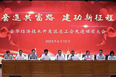 日前,6月12日下午,金華開發區總工會在李漁小學報告廳召開“奮進共富路,建功新征程”先進頒獎大會。經申報、推薦、審查、評審和公示等環節,我單位陳順通、姜濤二位員工榜上有名。生產副總監陳順通被授予2023年度“八婺金匠”榮譽稱號,生產副總監姜濤被授予2023年“金開工匠” 榮譽稱號。